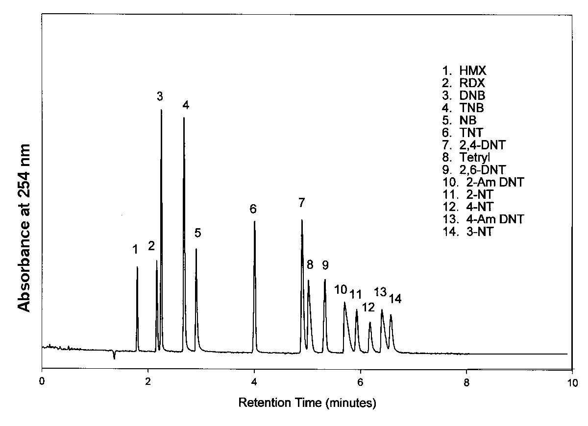 High-resolution separation of 14 explosives