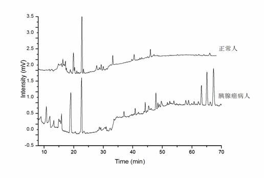 Electropherograms of human plasma from patients with pancreatic cancer and healthy individuals (eHPLC-UV)